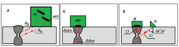 Суть метода заключается в следующем (рис.5.8 в). В контролируемое изделие продольные волны вводят прямым преобразователем. Наклонным преобразователем принимают два импульса трансформированных поперечных боковых волн под углом α = 56°30'. Первый импульс соответствует отражению ближайшей к преобразователю точке дефекта, второй – дифракции данного сигнала на противоположной точке дефекта. В случае объемного дефекта амплитуда первого импульса Alt значительно больше амплитуды второго Al't' по нескольким причинам.