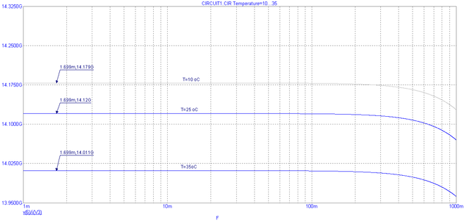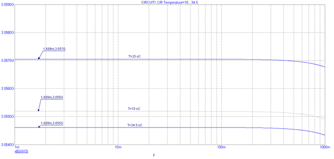 Рис. 13. Частотная характеристика выходного дифференциального сопротивления при вариации значений температуры t°C=10,25,35.