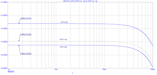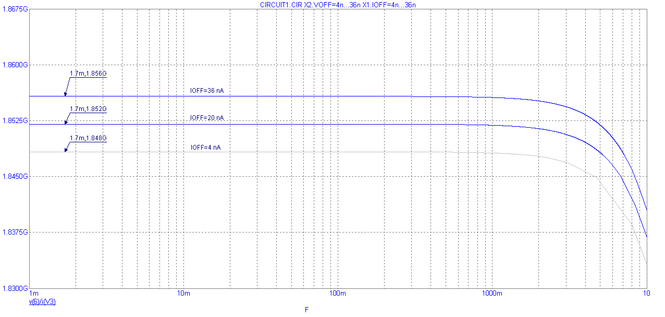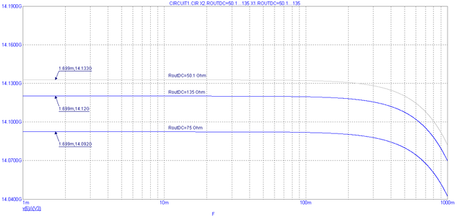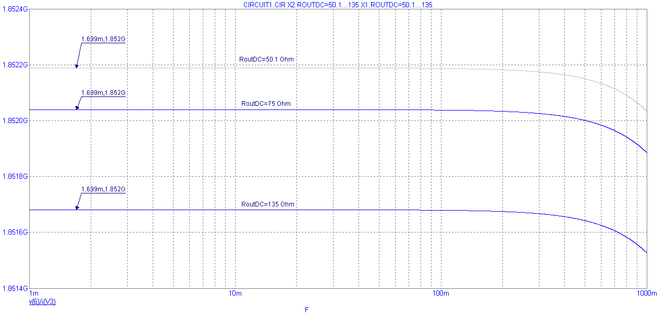 Рис. 17. Частотная характеристика выходного дифференциального сопротивления при вариации выходного сопротивления по постоянному току RoutDC ±80%.