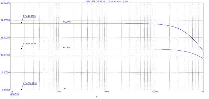 Рис. 16. Частотная характеристика выходного дифференциального сопротивления при вариации коэффициента усиления по постоянному току А ±1000%.