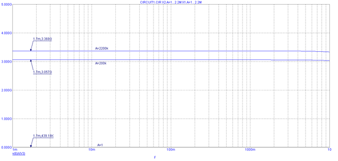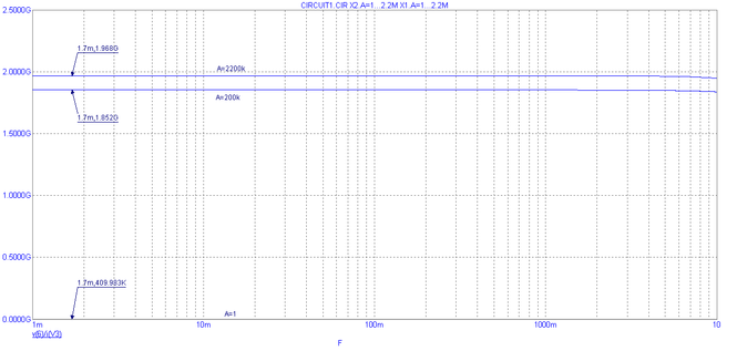 Рис. 11. Частотная характеристика выходного дифференциального сопротивления при вариации коэффициента усиления по постоянному току А ±1000%.