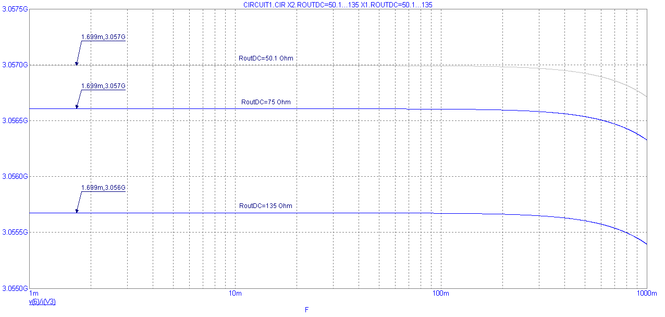 Рис. 12. Частотная характеристика выходного дифференциального сопротивления при вариации выходного сопротивления по постоянному току RoutDC ±80%.