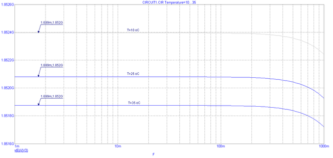 Рис. 18. Частотная характеристика выходного дифференциального сопротивления при вариации значений температуры t°C=10,25,35.