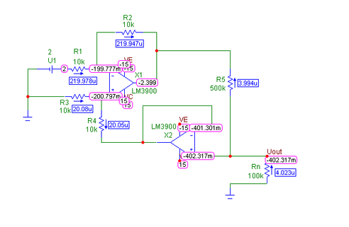 Рис. 3. Схема с назначенными значениями номиналов и результатами расчета по постоянному току.