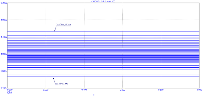 Рис. 19. Результаты анализа по методу Монте-Карло при вариации номиналов сопротивлений R1-R4 в 20% и Гауссовом распределении, изображены значения выходного тока.