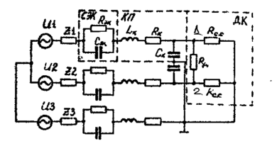 Эквивалентная схема кабеля пациента (КП) и представляет собой соединение R-, L-, С-элементов (см. рис. 4). Активное сопротивление Rк зависит от материала провода, его длины и диаметра и может быть вычислено по формуле: