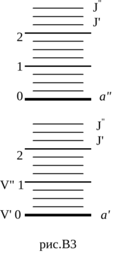 Энергетические уровни молекул сложнее атомных и включают уровни, соответствующие электронному, колебательному и вращательному движениям молекулы (рис.В3). Энергетические состояния, в которых может находиться молекула, характеризуется системой {n} уравнений Шредингера