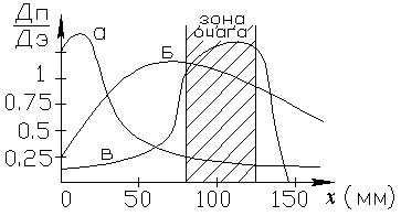 При облучении организма ИИ при лучевой терапии в участках тканей, находящихся на разных глубинах, поглотится разная величина энергии, поэтому поглощенная доза (DП) для этих глубин будет разная. Для излучения с малой энергией фотона распределение DП по глубине будет определяться экспоненциальным законом Бера ослабления интенсивности излучения. Жёсткое излучение вызывает эффект вторичной ионизации, а это повышает локальное выделение энергии на глубинах, где возникает вторичная ионизация. Такие эффекты могут приводить к появлению на некоторых характерных глубинах максимума поглощенной дозы DП. Чем выше энергия фотона, тем глубже сдвигается максимум. При лечении опухолей подбором жёсткости излучения достигают выделения максимальной энергии в местах очага (рис.2.5).