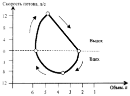 Рис. 1. Зависимость объемной скорости воздуха во время вдоха и выдоха от объемного расхода (петля поток-объем).