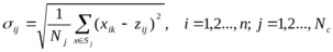 , где n есть размерность образа, xik есть i-я компонента k-ro объекта в подмножестве Sj, zij есть i-я компонента вектора, представляющего центр кластера zj, и Nj - количество выборочных образов, включенных в подмножество Sj. Каждая компонента вектора среднеквадратичного отклонения j характеризует среднеквадратичное отклонение образа, входящего в подмножество Sj, по одной из главных осей координат.