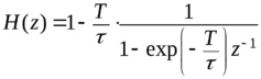 Теперь, имея импульсную характеристику искажающего фильтра, можно, вводя дискретное время, получить системную функцию дискретного фильтра (сначала дискретизируем время в переходной функции фильтра затем, дифференцируем по индексам отсчетов для получения дискретной импульсной характеристики и после этого с использованием суммы геометрической прогрессии выполняем прямое Z-преобразование):