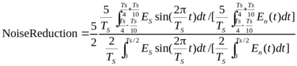 Но основным следствием стробирования является эффективное улучшение отношения “Сигнал/Шум” (или SNR – Signal to Noise Ratio) по сравнению с традиционным синхронным детектором. Это улучшение количественно можно оценить следующим образом. Пусть имеется гармонический сигнал с периодом TS, амплитудой ES. Пусть с ним аддитивно смешан некоторый стационарный шум En(t), энергия которого равномерно распределена во времени (это весьма точно выполняется для частот, удаленных от гармоник опорного колебания). Тогда для показателей увеличения SNR следует найти отношение средних величин (площадей):