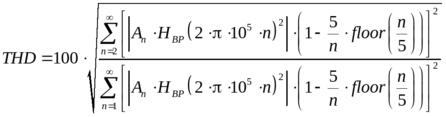 Количественный анализ "эффективного" коэффициента искажений, учитывающий интегрирование по периоду пятой гармоники, позволяет оценить следующая формула, описывающая "уничтожение" 5n-гармоник, в которой функция floor(x) определяет целую часть числа x: