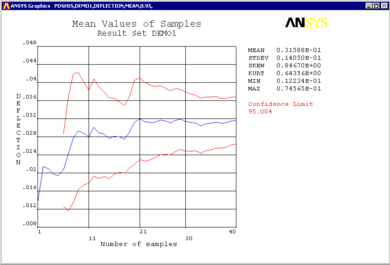 а рисунке показано изменение среднего значения и границ доверительного интервала прогиба пластины в зависимости от числа итераций. Рисунок, получившийся у вас, может несколько отличаться от показанного здесь, поскольку параметрам присваиваются случайные значения.