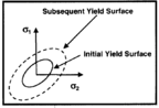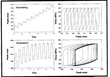 Существуют еще два варианта нагружения, важных с точки зрения циклического пластического деформирования: нарастание деформаций с каждым циклом по типу храповика (ratcheting) и так называемая «приспособляемость» (shakedown). При кинематическом упрочнении размах упругих напряжений, сопровождающих разгрузку, равен удвоенной величине предела текучести. Если образец при растяжении нагружается выше напряжений текучести, возникает пластическое состояние. Поверхность текучести перемещается, чтобы могли реализоваться упругие напряжения разгрузки, и это приводит к снижению уровня напряжений текучести при сжатии. Если теперь образец сжать той же нагрузкой, что и при растяжении, то поверхность текучести сместится вновь - для выполнения условий разгрузки. При уменьшении нагрузки до нуля завершается один полный цикл нагружения. Поверхность текучести смещается в область сжатия. Если вновь растянуть образец первоначальным усилием, то напряжения текучести снова будут превышены, что приведет к дополнительным пластическим деформациям. Эти деформации называются циклическим приращением деформаций. Они обусловлены сочетанием нагрузки, при которой превышаются начальные напряжения текучести, циклическим приложением нагрузки и наличием эффекта Баушингера. Следует заметить, что при учете анизотропии материала размах напряжений разгрузки мог бы оказаться равным удвоенной величине максимума достигнутых напряжений, и никакой пластичности после снятия растягивающей нагрузки не возникло бы.