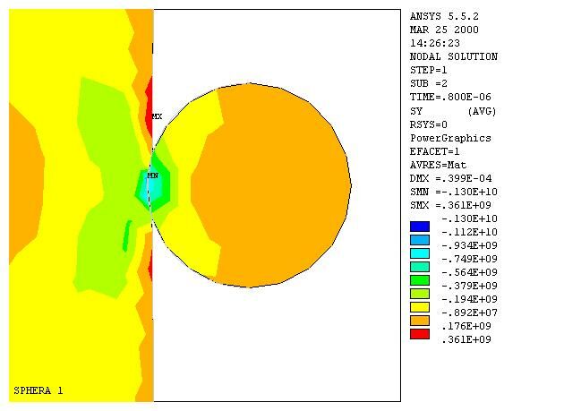 Рис.5. Поле напряжений у в момент наибольшего проникновения дроби в обрабатываемую поверхность. Первый удар(Vx = -50 м/сек, Vy= -30 м/сек.).