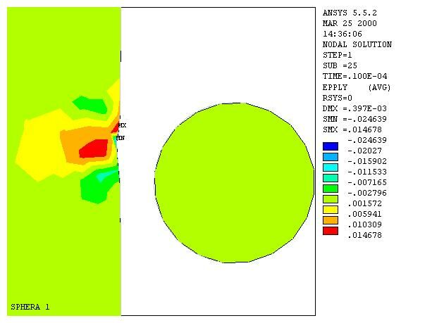 Рис.7. Поле остаточных пластических деформаций у после отскока дроби от обрабатываемой поверхности. Первый удар(Vx = -50 м/сек, Vy= -30 м/сек.).