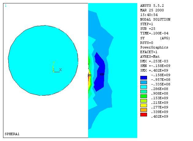 Рис.10. Поле остаточных напряжений у после отскока дроби от обрабатываемой поверхности. Третий удар (Vx = 24,3 м/сек, Vy=18,4 м/сек.).