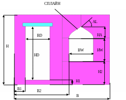 Здание сложено из кирпича с модулем Юнга ES , коэф. Пуассона VS и плотностью GS. Размеры вкладыша – BV x HV. Обозначения остальных размеров даны на рисунке. Все параметры – в системе СИ, угол – в градусах.