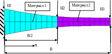 Узкая балка (ПНС) переменной толщины (см.рис.) сделана из двух материалов с характеристиками Ei, Vi, Pli, Dmi, i=1,2 (модуль Юнга, коэф. Пуассона, плотность и коэффициент внутренего трения соответственно). Балка закреплена консольно, в начальном состоянии (t=0) изогнута в форме параболы 4-ой степени Uy(x)=(x/B)4*UMAX, а затем отпущена и свободно колеблется. Начальные скорости – нулевые.