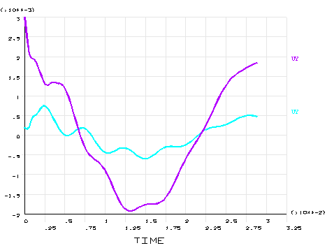 ровести полный нестационарный анализ и вывести графики зависимости от времени вертикального перемещения Uy в узлах на правом конце (x=B) и на середине (x=B/2) балки в течение одного периода первой собственной частоты. Построить анимацию по времени деформированной формы балки.
