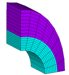 Рекомендуемые приемы: цилиндрическая и декартова глобальные СК, операции создания линий, сплайнов, построения областей по КТ, нанесения регулярной плоской сетки, отражения, экструдирования, копирования, слияния номеров совпадающих узлов и КТ.
