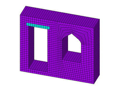 Построить конечно-элементную сетку и отобразить распределение первого главного напряжения при нагружении собственным весом, если нижняя грань стены жестко закреплена.