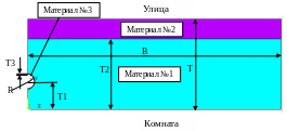 длинной двухслойной стене проложены трубы отопления с периодом 2*B. Трубы покрыты слоем гидроизоляционного материала толщиной T3. Температура в помещении – TB2, снаружи – TB1. На обеих свободных поверхностях имеет место конвективный теплообмен (г.у. 3-го рода) с коэф. теплопередачи AL2 и AL1 соответственно. Температура воды в трубе – TTR.