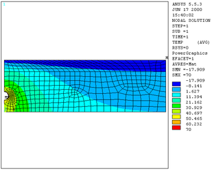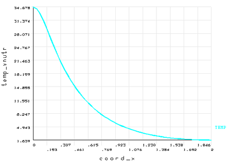 сновные приемы: примитивы (прямоугольники, полукольцо), оверлэппинг, удаление областей, размер элемента (общий и на линиях со сгущением), назначение атрибутов элементов на области, свободная разбивка, ограничения степеней свободы, г.у. конвективного теплообмена, выделение, статический анализ, постпроцессинг: графическое отображение результатов, заданных по пути (распределение температуры по внутренней поверхности стены).