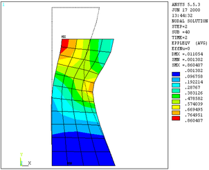 сновные приемы: примитивы (сплайны), построение области по КТ, общий размер элемента, регулярная разбивка, ограничения степеней свободы, таблицы нелинейных свойств (BKIN), выделение, установка типа анализа (статический, с учетом геометрической нелинейности), установка числа подшагов; постпроцессинг: описание и заполнение массива в цикле главного постпроцессора, перенос массива в таблицу временного постпроцессора, графическое отображение результатов (построение кривой зависимости силы от перемещения).