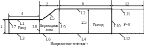 Расчетная схема приведена на рисунке. На первом этапе рассчитывается движение жидкости с Re=VDh/=400 (число Рейнольдса) - ламинарное течение. На втором меняются свойства среды и проводится расчет турбулентного течения, использующий в качестве начального приближения результаты первого этапа. Третий этап - расширение выходной зоны (удлинение) и решение задачи турбулентного течения воздуха. Во всех трех вариантах задается скорость потока на входе и нулевое давление на выходе. На стенках канала действует гипотеза полного прилипания.