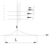 Рис. 1.3. Образование дипольной структыры на границе раздела. Слева электролит, справа белковый матрикс, стрелки указывают направление перехода электронов, L - характерная длина эквивалентного диполя р.