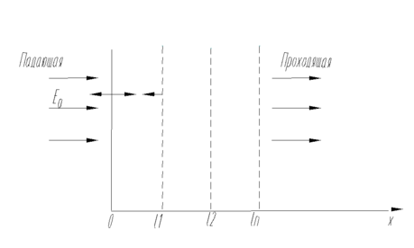 Пусть имеется N-слойный плоский объект на который падает плоская электромагнитная волна (соотношение между длиной волны и толщинами слоёв произвольное). Каждый n-ый слой характеризуется константой распространения Кn, а граница раздела между n-ым и (n+1)-м слоем имеет координату ln рис. 3.1.