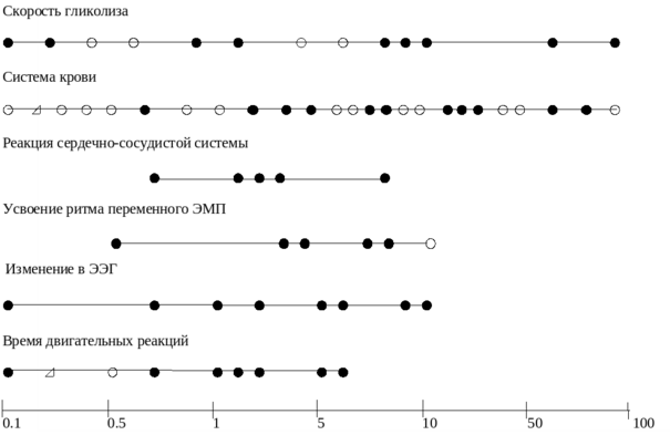 Рис. 4.2. Спектр действия инфранизкочастотных ЭМП по данным анализа публикаций [8].