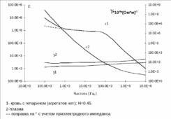 8 Электропроводность движущейся крови. На рис. 1.10 представлены основные процессы, влияющие на электрофизические свойства движущейся крови. Рис. 1.10. Дадим краткую характеристику относительно мало значимых (в большинстве практических ситуаций) первых четырех эффектов. 1. Образование агрегатов эритроцитов. Агрегация идет при малых скоростях течения, а точнее при малых скоростях сдвига. Пороговые значения, по данным экспериментов в кровеносных сосудах человека составляют: V0.2 (См/с); 2.7 с-1 Эти значения говорят о том, что практически для всех сосудов, кроме крупных венозных, влияние агрегации на электропроводность несущественно. 2. Формирование смазочного слоя плазмы. В кровеносном сосуде образуется пристеночный слой чистой плазмы (смазочный слой), характерный размер которого зависит от числа Рейнольдса и скорости сдвига. Для всех кровеносных сосудов, кроме капилляров, (в которых имеет место «поршневое» движение эритроцитов) толщина смазочного слоя не превышает 5-6 мкм. Удельное сопротивление плазмы в 2-3 раза меньше, чем крови. Отсюда по схеме параллельного включения нетрудно оценить вклад смазочного слоя, например в продольное, электрическое сопротивление крови в кровеносном сосуде. 3. Перераспределение эритроцитов в потоке крови. Этот эффект при физиологических значениях гематокрита дает малый вклад в изменение проводимости движущейся крови. Идея состоит в том, что с увеличением скорости профили зависимости гематокрита от радиуса сосуда становятся более вытянутыми (эритроциты сконцентрированы в ядре потока). Рис. 1.11. Профили линейной скорости и гематокрита в кровеносном сосуде. На рисунке 1.11 качественно представлены профили скорости и соответствующие им распределения концентрации эритроцитов по сечению сосуда. Во втором случае профиль H2(r), более вытянут. Продольное сопротивление столбика крови в кровеносном сосуде определяется, как бы двумя областями: центральной (ядро потока), в которой сосредоточено большинство эритроцитов, и пристеночной, которая обеднена эритроцитами. Продольное электрическое сопротивление сосуда можно оценить, представив его параллельно включёнными сопротивлениями соответствующих областей. Прямые эксперименты показали, что если взять обычные эритроциты и измерять продольное сопротивление столба крови в жёстком сосуде, а затем изменить форму тех же эритроцитов - сделать их сферическими, например, за счёт нагрева, то изменения в сопротивлении движущегося и покоящегося потока исчезают. Эксперименты показали, что вклад этого эффекта в изменение проводимости находиться в пределах 3-4 %, в то время как, реальные изменения проводимости при движении крови составляют 15-25%. | 6 Электрическая проводимость крови. Эти свойства важны для широкого спектра задач биоинженерии, среди которых диагностические методы исследования: кондуктометрия (измерение расхода крови, измеряемое по изменению сопротивления); импедансные методы диагностики, а также большое количество терапевтических методов, в которых на кровеносные сосуды осуществляется электромагнитное воздействие, спектр которого простирается от инфранизких частот до оптического диапазона. Спектры диэлектрической проницаемости и проводимости крови с хаотически ориентированными эритроцитами и в отсутствие потока (без движения) представлены на р