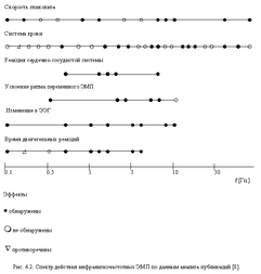 Без особых комментариев, в качестве информации к размышлениям, приведём данные анализа многочисленных публикаций по реакциям различных систем организма на инфранизкочастотные электромагнитные поля (рис. 4.2). Причем, необходимо отметить, что далеко не во всех работах эксперименты были метрологически обоснованы, и в этом смысле всегда трудно делать определенные выводы о эффективности воздействия, сравнения различных по своим параметрам воздействий, а уж тем более говорить о физических и физиологических механизмах.
