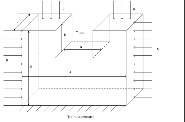 Дана исследуемая область (Рисунок 1) с граничными условиям (Tсреды или Tср равносильно теплообмену со средой). Геометрические параметры области A, B, L, a, b, l [см] задаются самостоятельно. Воздействие теплового потока принять равным