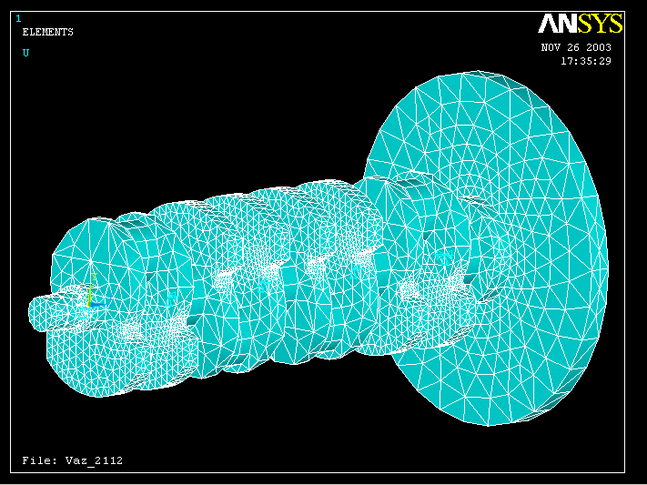 Далее необходимо разбить всю сборку на конечные элементы. Для этого выполняется команда MeshTool: Preprocessor Meshing MeshTool. В появившемся окне следует установить размер конечного элемента SmartSize – 6 (установлено по умолчанию). Затем нужно выбрать тип разбивки Mesh: назначается tet, free – разбивка тетраедрами (установлено по умолчанию), и затем OK. Далее на модели выбираются мышью объемы сложной геометрической формы (например щеки, маховик) и нажимается Apply. Производится разбивка. Затем снова осуществляется запуск команды Meshtool и устанавливается тип разбивки Hex, Sweep – это разбивка восьмигранниками, и выбираются элементы простой геометрической формы (в нашем случае это цилиндрические шатунные шейки, полуцилиндры коренных шеек). Вообще разбивка может осуществляться лишь в форме тетраедров, но это ведет к увеличению числа конечных элементов и к значительному увеличению времени расчета. Если какие-либо участки модели не были разбиты методом Sweep, то их нужно разбить тетраедрами (Tet,Free). Количество конечных элементов можно отслеживать в окне ANSYS Output Window – Maximum element number.