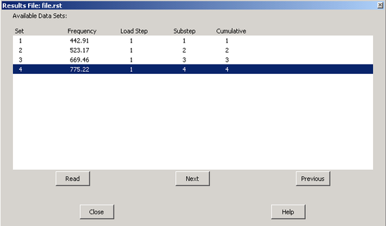 После выполнения расчета можно сделать просмотр результатов: Результаты расчёта вызываются командой: General postprocessorRead resultsResults summary – где выдаются значения вычисленных собственных частот. Выбрав строку с интересующей частотой нужно нажать кнопку Read, таким образом данная частота занесена в память программы.