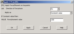 | Рисунок 15. Задание перемещений на линии Рисунок 16. Задание растягивающей нагрузки | 2.4.1. Задание перемещений Main Menu > Solution > Define Loads > Apply > Structural > Displacement > On Lines Укажите мышкой линию, по которой закреплена пластина, или введите ее номер в окне выбора (линия 4), после чего нажмите ОК. В открывшемся окне (Рисунок 15) выберите ALL DOF и нажмите ОК. 2.4.2. Приложение растягивающей силы Main Menu > Solution > Define Loads > Apply > Structural > Force/Moment > On Keypoints Укажите мышкой ключевую точку, к которой приложена растягивающая сила, или введите ее номер в окне выбора (точка 2), после чего нажмите ОК. В открывшемся окне (Рисунок 16) в поле VALUE введите значение растягивающей силы 5000, остальные поля, определяющие направление вектора силы и его характер остаются без изменения, т.к. нам требуется постоянная сила действующая по оси Ox.