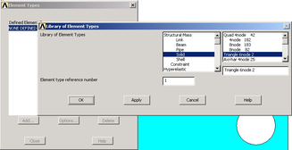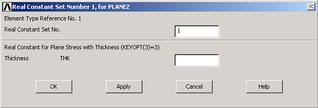 | Рисунок 9. Выбор типа элемента Рисунок 10. Задание опций элемента Рисунок 11. Задание реальных констант | 2.1.1. Выбор типа элемента Main Menu > Preprocessor > Element Type > Add/Edit/Delete В открывшемся окне "Element Type" нажмите Add… и в появившейся библиотеке элементов выберите Structural > Solid > Triangle 6node 2 (Рисунок 8). Нажмите OK. В окне "Element Type" нажмите Options… и в открывшемся диалоговом окне в раскрывающемся списке Element Behavior выберите Plane strs w/thk (Рисунок 9) и нажмите ОК. Закройте окно "Element Type" нажав Close. 2.1.2. Определение реальных констант Main Menu > Preprocessor > Real Constants В открывшемся списке "Real Constants" нажмите Add… и выберите тип элемента PLANE2. Нажмите OK. В диалоговом окне задайте толщину элементов (Thickness) равную 10. Нажмите OK. Закройте список "Real Constants" нажав Close.