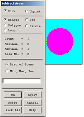 | Рисунок 8. Окно выбора при логических операциях над поверхностями | Main Menu > Preprocessor > Modeling > Operate > Booleans > Subtract > Areas Укажите мышкой поверхность пластины или введите ее номер в окне выбора (Рисунок 8) (поверхность 1), после чего нажмите ОК. Укажите мышкой вспомогательную поверхность отверстия или введите ее номер в окне выбора (поверхность 2). Нажмите ОК. Примечание: Приведенный алгоритм построения геометрической модели не является оптимальным. Он приведен с целью демонстрации возможностей ANSYS.