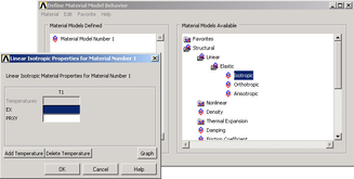 | Рисунок 12. Задание свойств материала | Main Menu > Preprocessor > Materials Props > Material Models В окне "Define Material Model Behavior" выберите Structural > Linear > Elastic > Isotropic и в открывшемся диалоговом окне (Рисунок 12) введите свойства материала согласно таблице 1. Нажмите ОК. После этого окно "Define Material Model Behavior" можно закрыть.