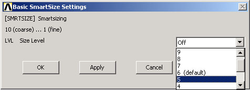 | Рисунок 13. Задание параметров автоматической генерации сетки | 2.3.1. Задание параметров автоматической генерации конечноэлементной сетки Main Menu > Preprocessor > Meshing > Size Cntrls > SmartSize > Basic В диалоговом окне выберите уровень дискретизации (по степени точности): 6 (default). Нажмите ОК. | ||||||||||