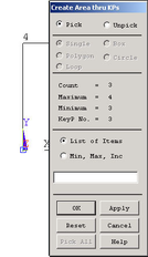 | Рисунок 2. Диалоговое окно построения ключевых точек Рисунок 3. Окно выбора при построении поверхности по ключевым точкам | 1.1.1. Построение ключевых точек (keypoints) пластины Main Menu > Preprocessor > Modeling > Create > Keypoints > In Active CS В открывшемся диалоговом окне (Рисунок 2) введите координаты первой ключевой точки (0;0;0). Номер ключевой точки (NPT) можно не вводить – ANSYS может автоматически подставить его. Нажмите Apply. Аналогичным образом введите координаты следующих точек: (200;0;0), (200;50;0) и (0;50;0). После ввода координат четвертой точки нажмите OK. 1.1.2. Построение поверхности по ключевым точкам Main Menu > Preprocessor > Modeling > Create > Areas > Arbitrary > Through KPs Последовательно выберете мышкой ключевые точки будущей поверхности или введите номера точек в окне выбора (1, 2, 3 и 4 нажимая клавишу "Enter"). По окончании выбора нажмите OK.