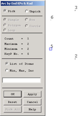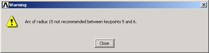 | Рисунок 4. Окно выбора при построении дуги по ключевым точкам и радиусу. Рисунок 5. Параметры дуги Рисунок 6. Окно предупреждения Рисунок 7. Отображение построенных поверхностей | 1.2.1. Построение ключевых точек Main Menu > Preprocessor > Modeling > Create > Keypoints > In Active CS В открывшемся диалоговом окне (Рисунок 2) введите координаты точек, лежащих на диаметре отверстия (175;10;0) и (175;40;0). Нажмите OK. 1.2.2. Построение дуг окружности Main Menu > Preprocessor > Modeling > Create > Lines > Arcs > By End KPs & Rad Укажите мышкой ключевые точки концов дуги или введите номера точек в окне выбора (рисунок 4) (5 и 6 нажимая клавишу "Enter"). По окончании выбора нажмите OK. Далее необходимо выбрать точку, определяющую ориентацию дуги, или ввести ее номер в окне выбора (точка 2) после чего нажать OK. В открывшемся диалоговом окне можно проверить введенные номера ключевых точек, и ввести значение радиуса дуги (15). Нажмите OK. ANSYS выдаст окно с предупреждением (Рисунок 6), которое необходимо закрыть. Аналогично строится вторая дуга между точками 5 и 6, точкой ориентации для которой служит ключевая точка 4. 1.2.3. Построение поверхности по линиям Main Menu > Preprocessor > Modeling > Create > Areas > Arbitrary > By Lines Укажите мышкой линии ограничивающие поверхность или введите их номера в окне выбора (линии 5 и 6), после чего нажмите ОК. 1.2.4. Отображение построенных поверхностей Utility Menu > Plot > Areas
