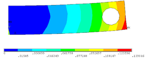 | Рисунок 21. Поле распределения эквивалентных (по Мизесу) напряжений | Main Menu > General Postproc > Plot Results > Contour Plot > Nodal Solu В открывшемся диалоговом окне (Рисунок 19) выберите тип интересующего нас результата – Stress и его обозначение – von Mises SEQV (эквивалентные напряжения по Мизесу). Нажмите ОК. Результат отображения поля эквивалентных напряжений в пластине представлен на рисунке 21.