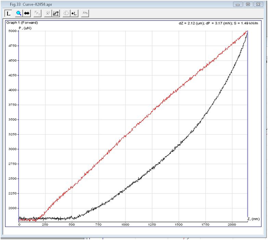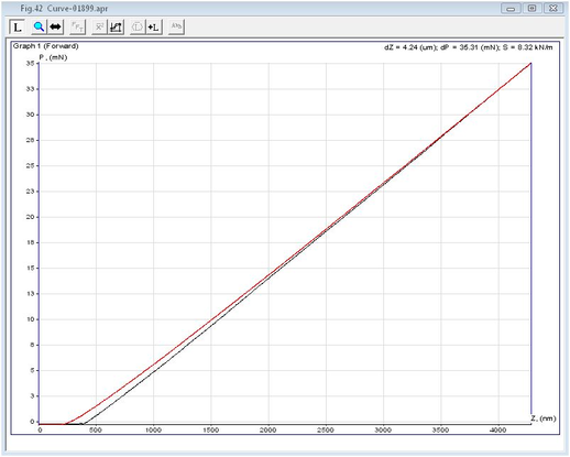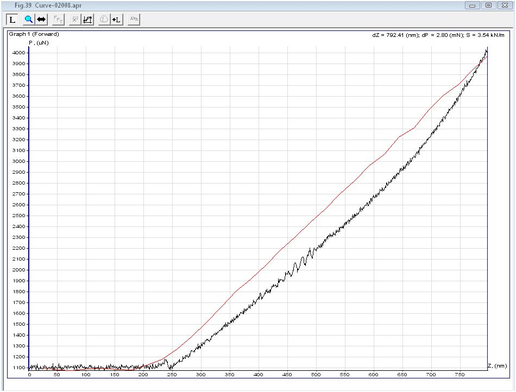Для сравнения ниже диаграммы нагрузки-разгрузки индентора (красная линия – это нагружение, черная - разгрузка). Область между этими линиями – это работа пластической деформации, область за линией разгрузки – работа упругой деф-и.
