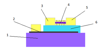 1 – Подложка Si со слоем SiO2 2 – Слой графена(затвор) 3 – Электрод сток из Ti/Al 4 – Канал из слоёв MoS2 5 – Электрод исток из Ti/Al