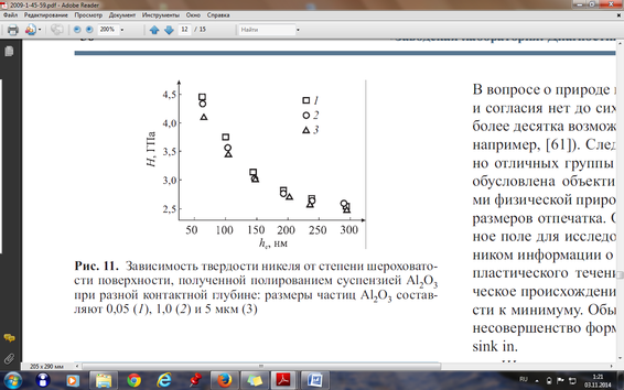 Шероховатость поверхности. Известно, что шероховатость изучаемой поверхности существенно влияет на достоверность результатов наноиндентирования. Так в одном из литературных источников было установлено, что чем шероховатость поверхности меньше, тем твердость материала (Ni) выше (см. Рис.8).